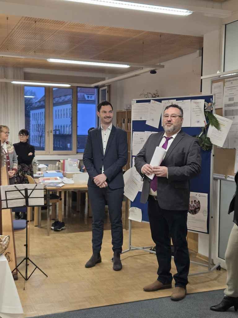 Als besonderer Gast durfte von HR Direktor Markus Krainz und von PV-Obfrau Prof.in Angelika Resztej zu dieser frühen Morgenstunde LR Mag. Peter Reichmann, seit 23. Oktober als Landesrat unter anderem für die Bildungsagenden zuständig, begrüßt werden. Nach der Feier, die vom IBG-Lehrerquartett und von Prof.in Brigitte Biedermann-Pilz mit Harfenklängen musikalisch umrahmt wurde 🎶, wurden im Austausch mit LR Peter Reichmann wichtige bildungspolitische Fragen erörtert, etwa: Wie könnte die Bildungslandschaft in Kärnten in Zeiten budgetärer Krisen dennoch gefördert werden, genauso wie der notwendige Ausbau der Schulsozialarbeit? Wie könnte neben dem Kinderschutzkonzept ein Lehrer:innenschutzkonzept für ein wertebasiertes Miteinander im Schulalltag sorgen? Auch die 8afi-Klasse nutzte später in der Bibliothek die Möglichkeit, diesbezügliche Fragen an den neuen Bildungslandesrat zu stellen. 📚💬