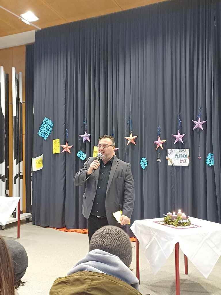 Die Weihnachtsfeier wurde durch ein Akkordeon-Stück 🪗 von Herbert Pixner, interpretiert von Lucas Tschinkel, Schüler der 8afi-Klasse 🎓, einbegleitet und durch Begrüßungsworte 💬 von Direktor Markus Krainz eröffnet. Lucas Tschinkel führte außerdem durch das abwechslungsreiche Programm 🎤.