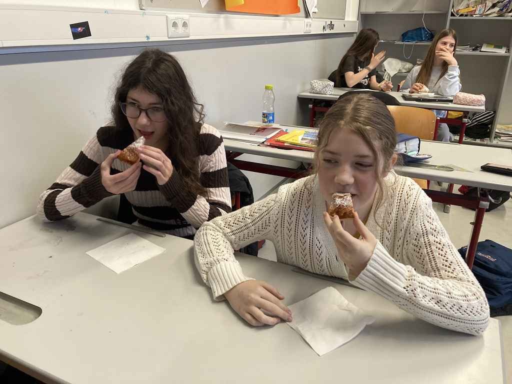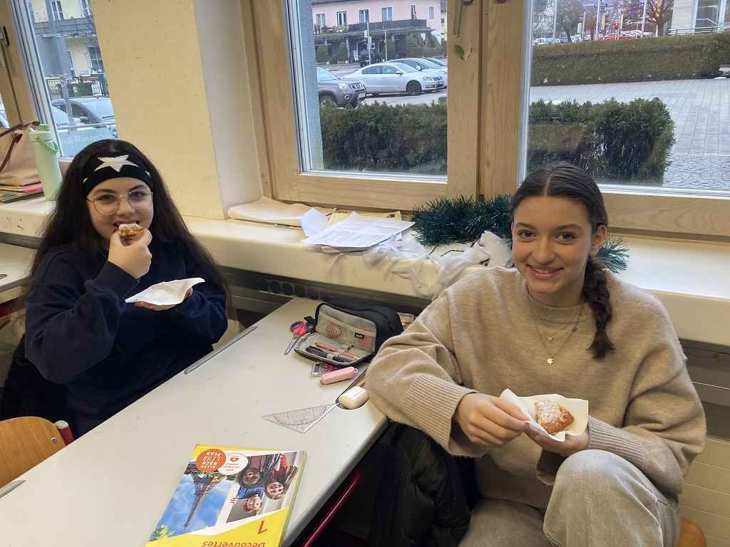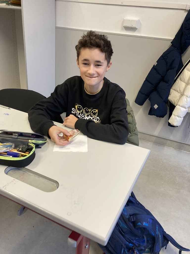 Am 29. Jänner 📅 ist Frau Prof. Buchmayer mit einer Überraschung 🎁 eingetreten. Sie hat eine selbstgebackene Galette 🥧 mitgebracht. Zuerst musste der jüngste der Gruppe unter einen Tisch krabbeln 🙃 und in die entgegengesetzte Richtung schauen 👀, in der der Kuchen aufgeschnitten wurde. Dann bekam jeder ein Kuchenstück 🍰, die Person unter dem Tisch bestimmte, welches Stück für wen ist. Nachdem jeder ein Stück bekommen hat, fängt man an zu essen 😋. Wer das Figürchen im Kuchen hat, wird den ganzen Tag bedient 🤴👑. Marius zog die Figur, er wurde König 👑 und wünschte sich ein Vokabelspiel 🎲📚.