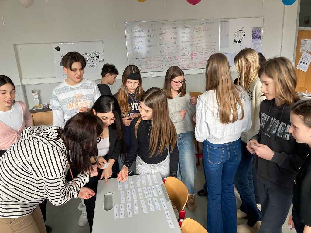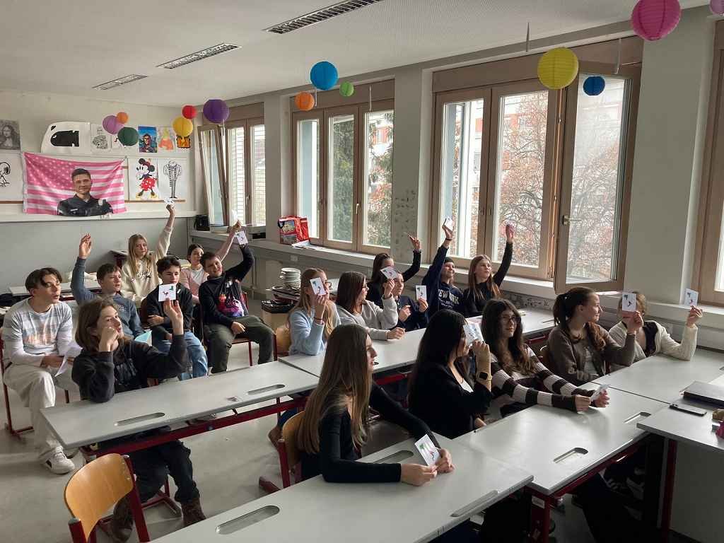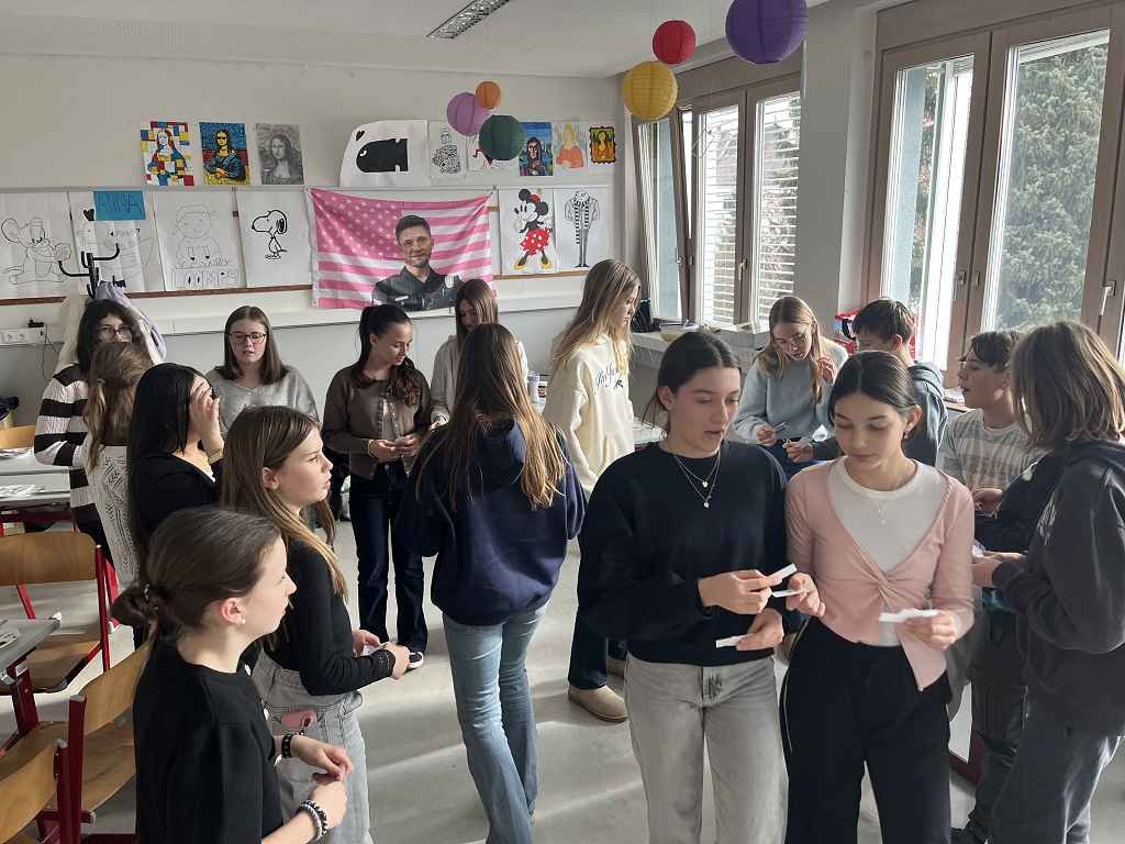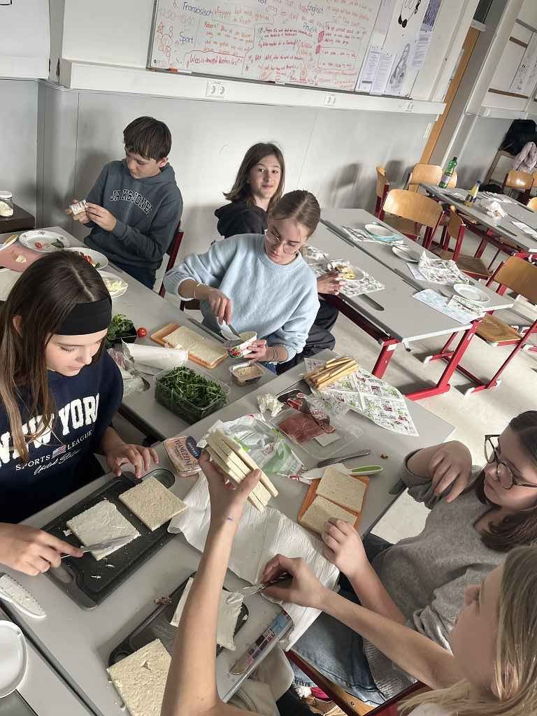 In dieser Klasse werden zwei Fremdsprachen unterrichtet: Französisch und Italienisch. 🇫🇷🇮🇹 Am Ende des ersten Semesters präsentierte jede Gruppe der anderen, was sie im vergangenen Semester gelernt hatte. 📚 Begonnen wurde mit einer Art Memory, bei dem man die gleichen Wörter in beiden Sprachen finden musste. 🧠 Es wurden liebevoll zwei Theaterstücke vorbereitet, die jeweils den Unterricht in der Gruppe darstellten. 🎭 Ebenso wurden von den Italienern delikate Tramezzini zubereitet, während die Franzosen köstliche Crêpes herstellten. 🥪🥞 Am Ende der Doppelstunde gab es ein Quiz über berühmte Persönlichkeiten aus beiden Ländern. ❓✨“ Jacob Suppanz