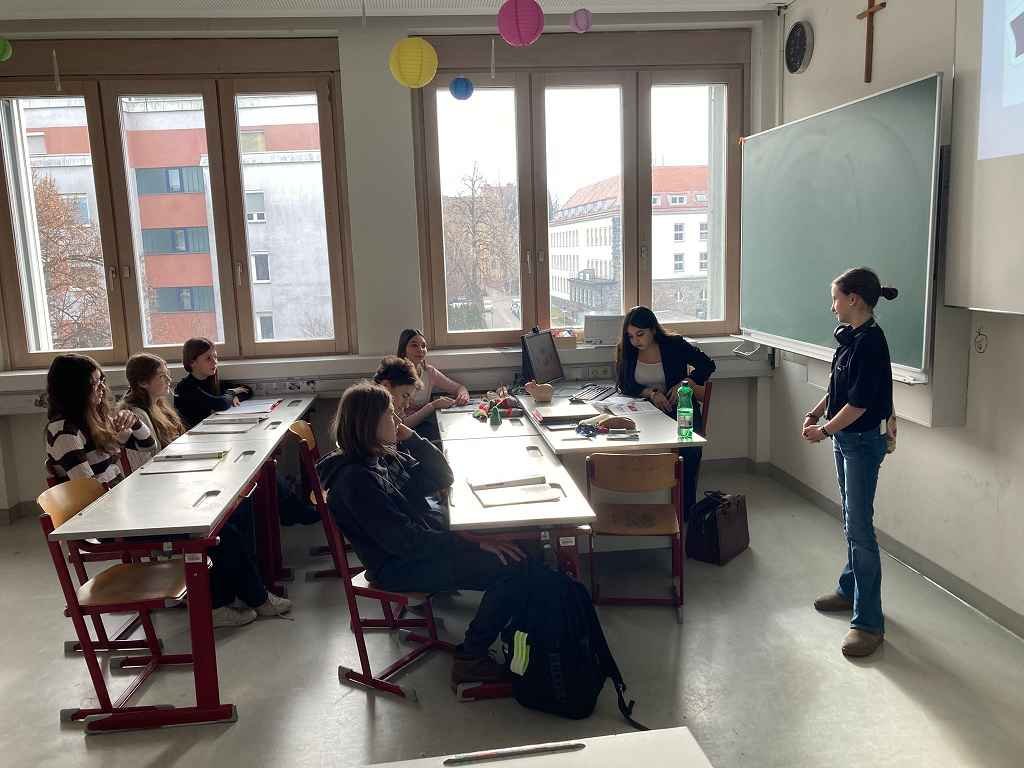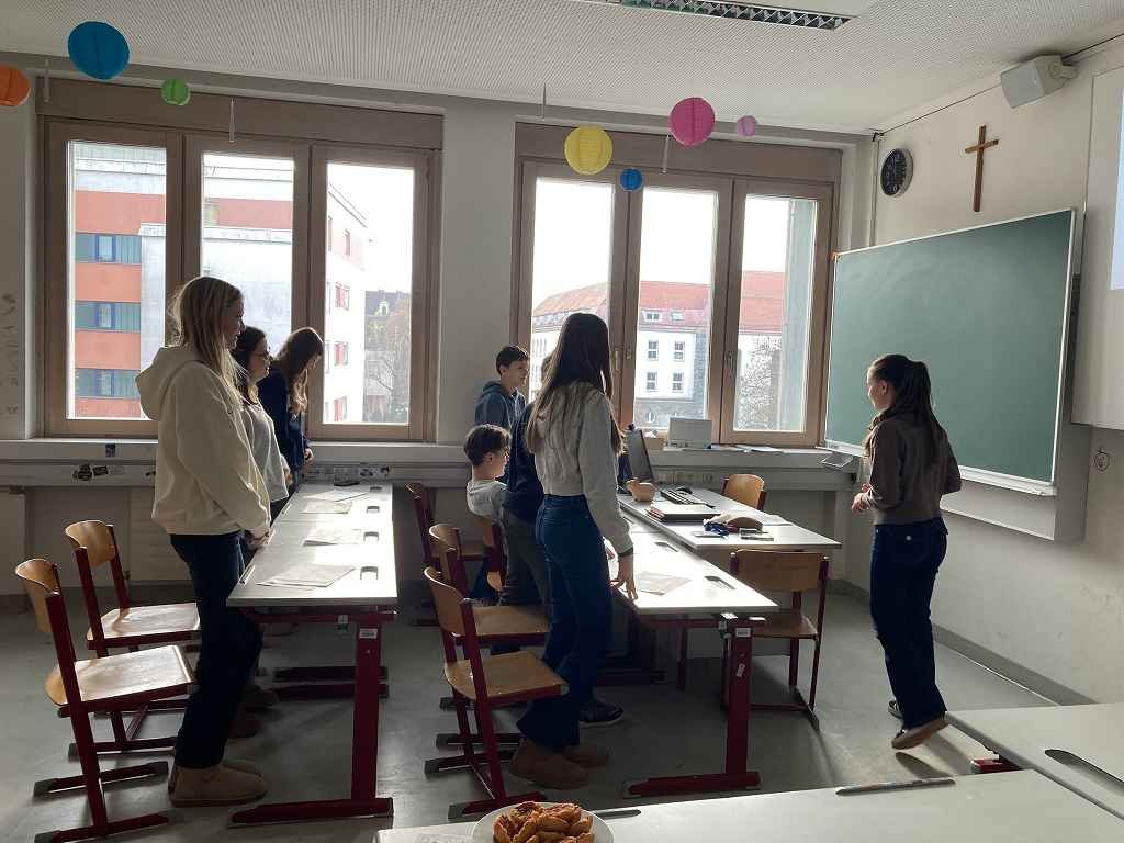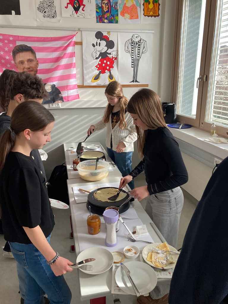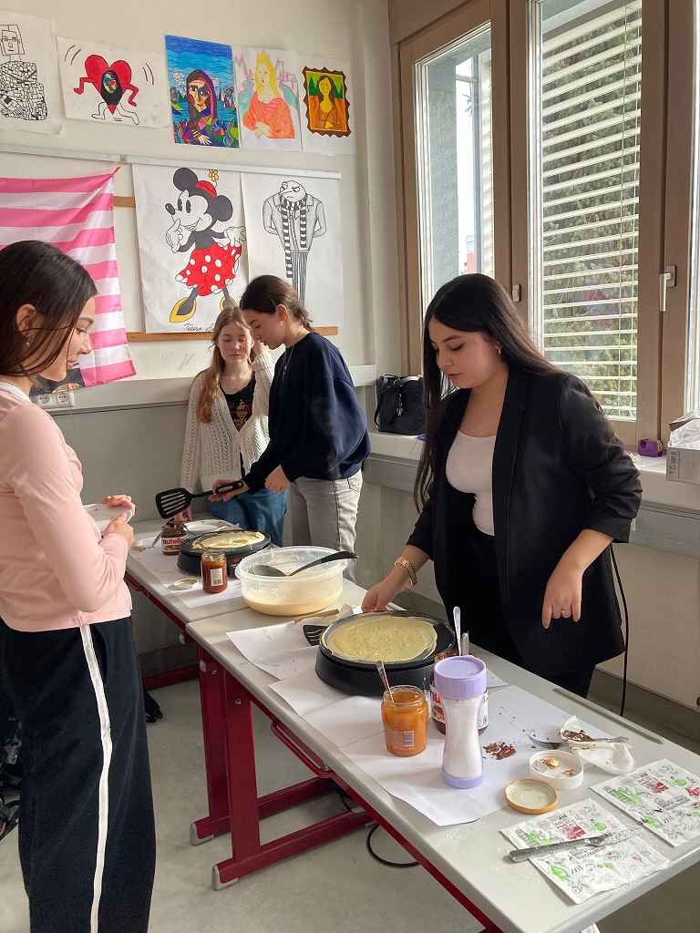 In dieser Klasse werden zwei Fremdsprachen unterrichtet: Französisch und Italienisch. 🇫🇷🇮🇹 Am Ende des ersten Semesters präsentierte jede Gruppe der anderen, was sie im vergangenen Semester gelernt hatte. 📚 Begonnen wurde mit einer Art Memory, bei dem man die gleichen Wörter in beiden Sprachen finden musste. 🧠 Es wurden liebevoll zwei Theaterstücke vorbereitet, die jeweils den Unterricht in der Gruppe darstellten. 🎭 Ebenso wurden von den Italienern delikate Tramezzini zubereitet, während die Franzosen köstliche Crêpes herstellten. 🥪🥞 Am Ende der Doppelstunde gab es ein Quiz über berühmte Persönlichkeiten aus beiden Ländern. ❓✨“ Jacob Suppanz