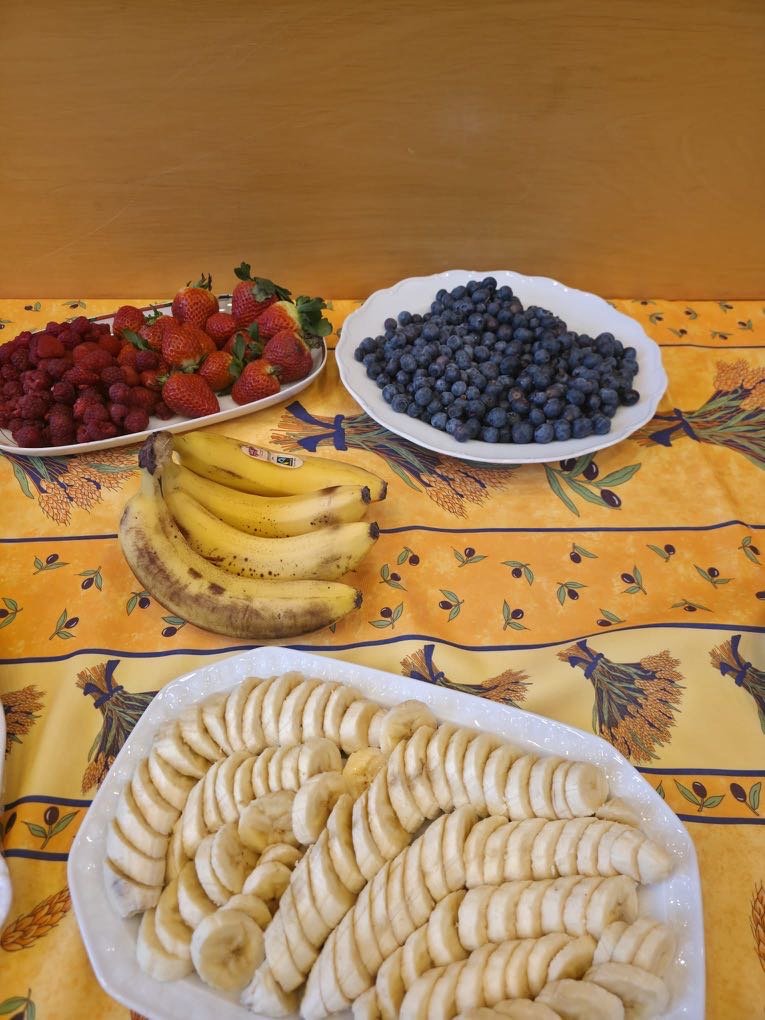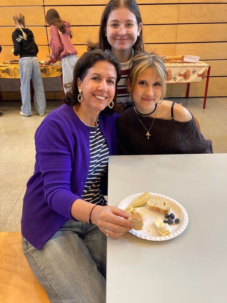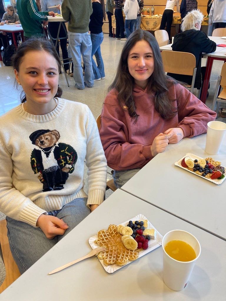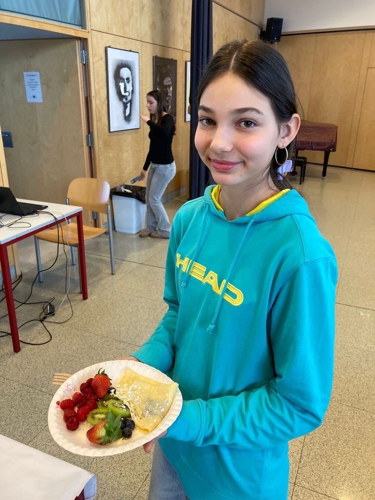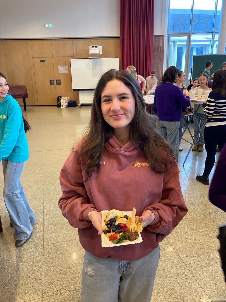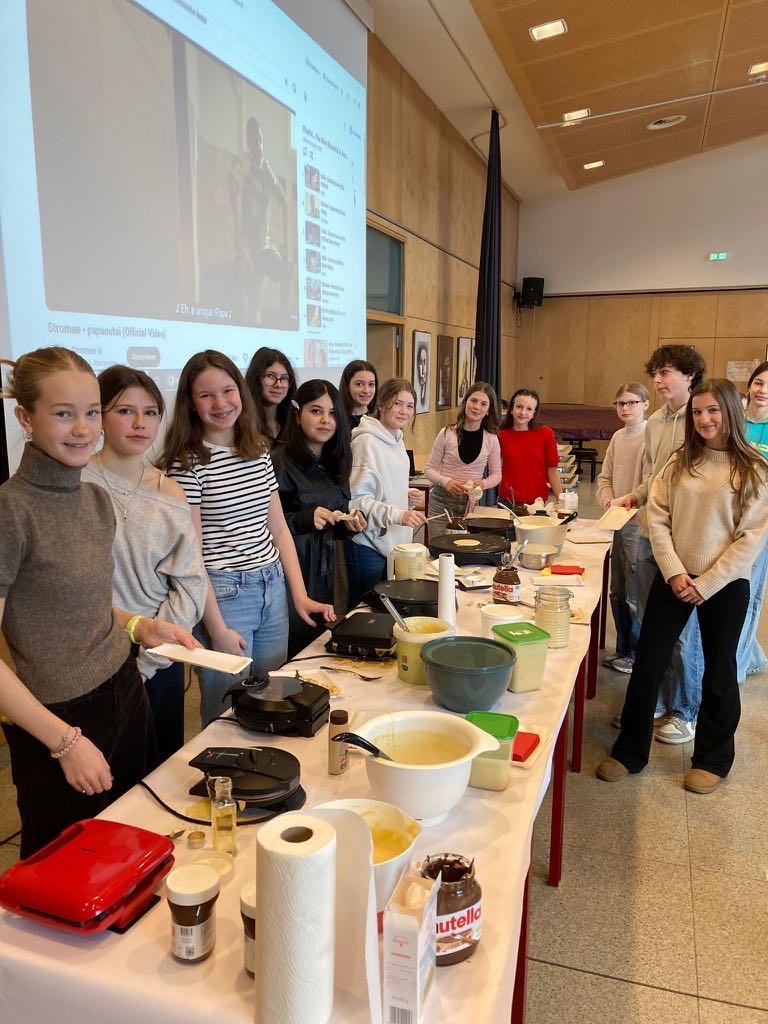 Beim traditionellen pétit déjeuner français durften sich unsere Französisch-Schüler:innen über selbstgemachte Crêpes und Gaufres freuen. Dazu gab es köstlichen Camembert und Brie mit frischem Baguette – einfach délicieux!