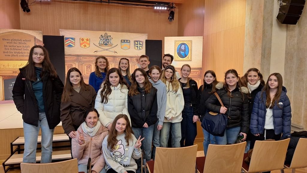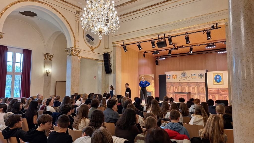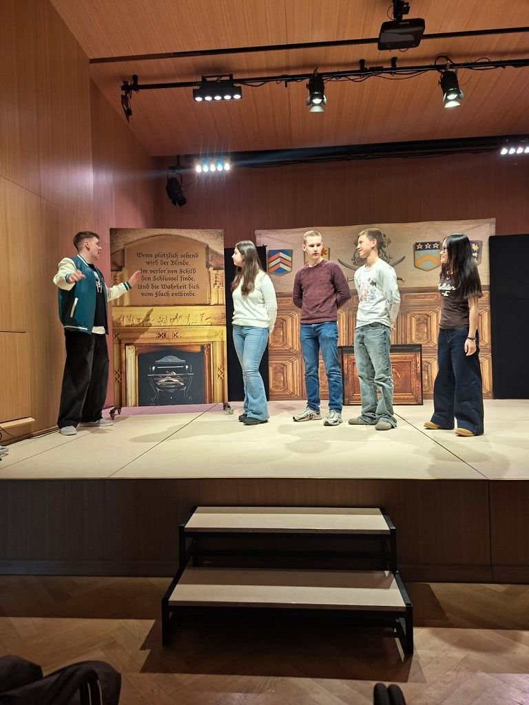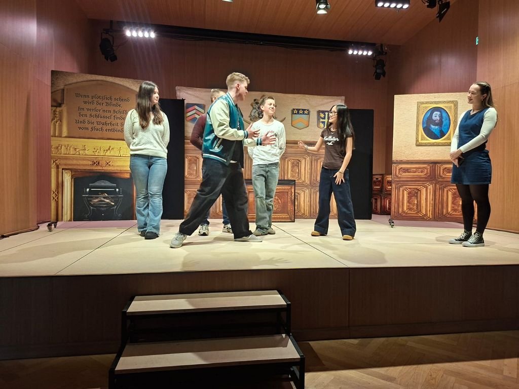 Ein besonderes Highlight: Vier Schüler:innen durften mit den britischen Schauspieler auf die Bühne und ein deutsches Rätsel auf Englisch übersetzen – und so für ein Happy End sorgen.