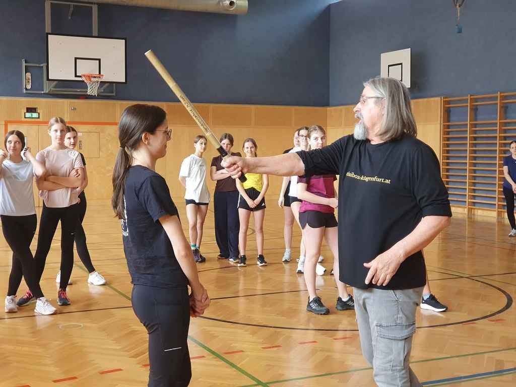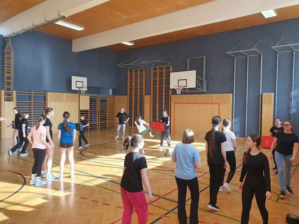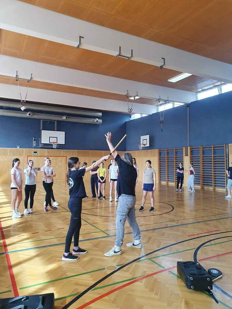 Herr Markus Bucsek von der gleichnamigen Kampfsportschule zeigte ihnen verschiedene Griffe zur Selbstverteidigung sowie Einblicke in Kampfsportarten wie Thaiboxen. Unterstützt wurde er dabei von unseren Schüler:innenLisa (4b) und Roman (2f), die gemeinsam mit den ausgebildeten Trainer:innen die Übungen durchführten.