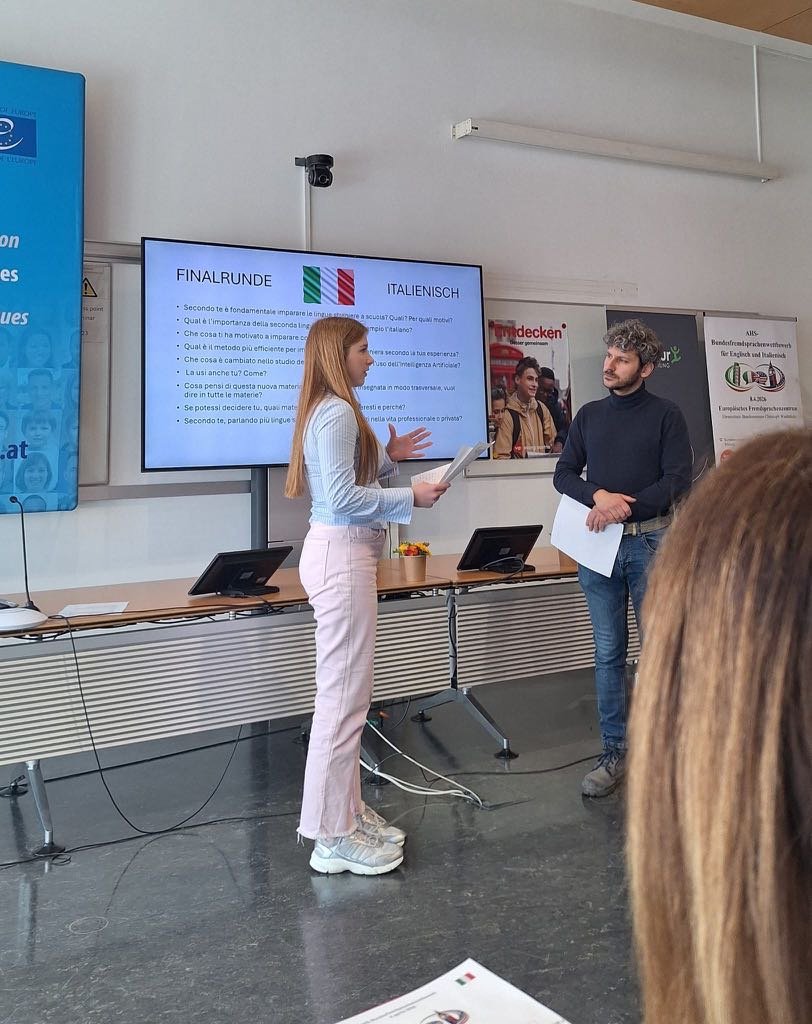 In der Finalrunde diskutierte sie über die Rolle der künstlichen Intelligenz beim Sprachenlernen und über die Bedeutung von Sprachen, die Zugang zu neuen Kulturkreisen ermöglichen. Oleksandra darf sich nun als Prämierung über eine einwöchige Sprachreise in Rom freuen. Am Vortag gab es auch eine italienische Stadtführung durch Graz und ein gemütliches Abendessen, wo sich alle Kandidat:innen aus Österreich kennenlernen konnten. Grazie per il bel tempo trascorso insieme. Oleksandra, sei stata bravissima 🤗☀️🇮🇹