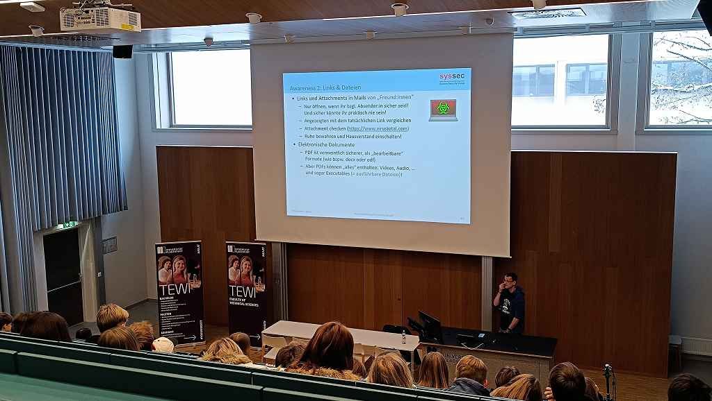 Nach der Begrüßung startete das Programm mit einer Schnupper-Vorlesung. In der Schnupper-Vorlesung „Ohne Sicherheit geht’s nicht lange gut!“ gab Peter Schartner einen anschaulichen Einblick in das Thema Cybersecurity. Die Schüler:innen erfuhren, warum digitale Sicherheit im Alltag immer wichtiger wird und wie Informatik dabei hilft, Daten, Geräte und Systeme zu schützen.